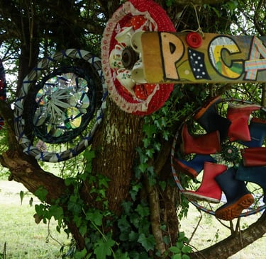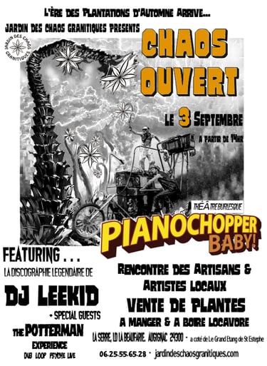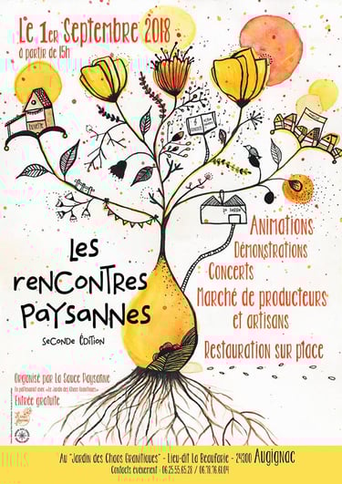Nous sommes fière de régulièrement recevoir des groupes scolaires et les centres de formation. Nous avons accueilli des expositions de sculpture pendant nos Portes Ouvertes. Nous avons organisé des Marchés paysans, des formations de greffage, de permaculture, d'osier, de sculpture de récup, de découverte de plantes sauvages et comestibles, de forêts nourricières, ainsi que des interventions dans les écoles locales, 3 'Rencontres Paysannes', des mini festivals organisé en partenariat avec l'asso La Sauce Paysanne, des performances, des BD's, du cirque, du radio & DJ's, même un marriage!! Au Jardin des Chaos Granitiques nous nous engageons à faire vivre notre campagne et promouvoir la créativité, la solidarité et l'autosuffisance.